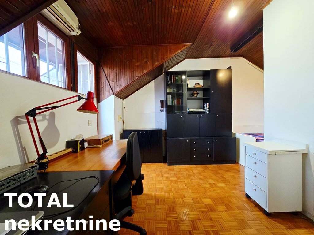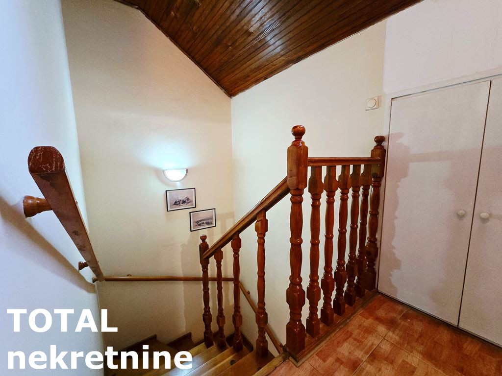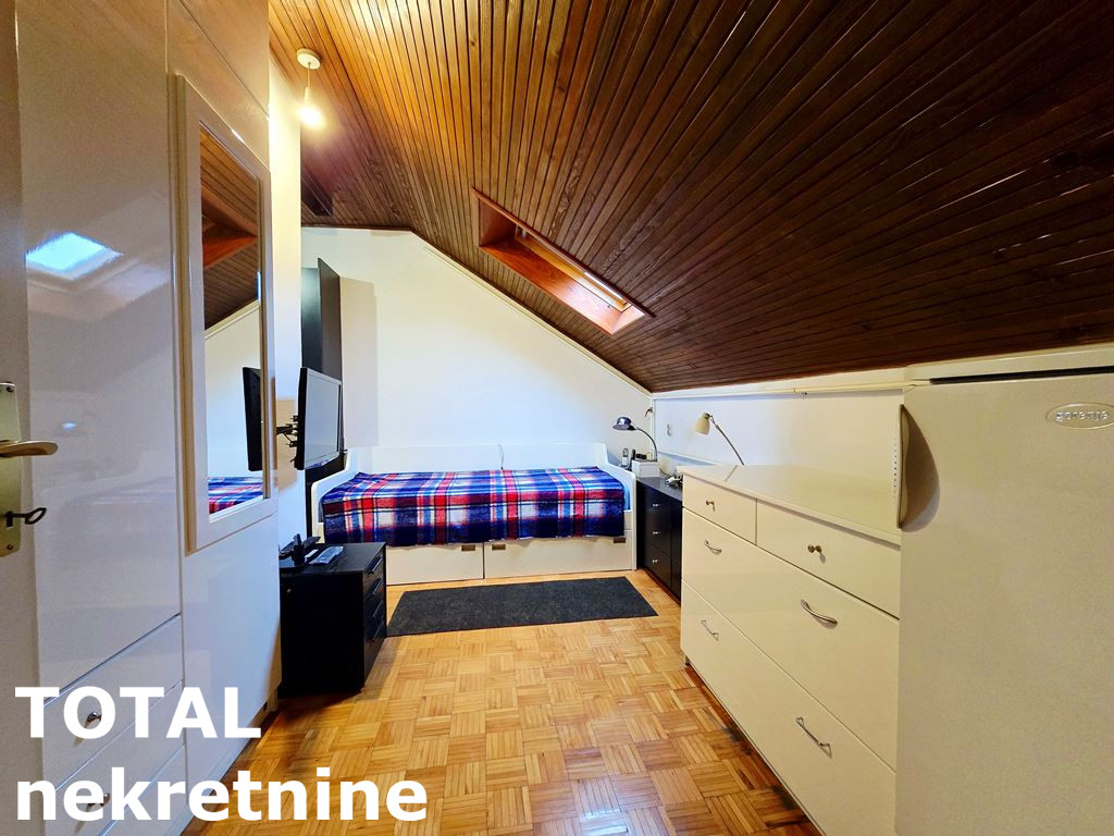Na gornjem nivou stana 48,97m2 dostupnog kružnim stepenicama od punog drveta, postoji mogućnost korišćenja prostora kao jedna ili dve sobe, uz klasično kupatilo i tavanski prostor. Posebnu prednost čini velika otvorena terasa 17,11m2 okrenuta prema unutrašnjem prostoru kvarta, uz mir, tišini i potpunu privatnost ovog prostora.
