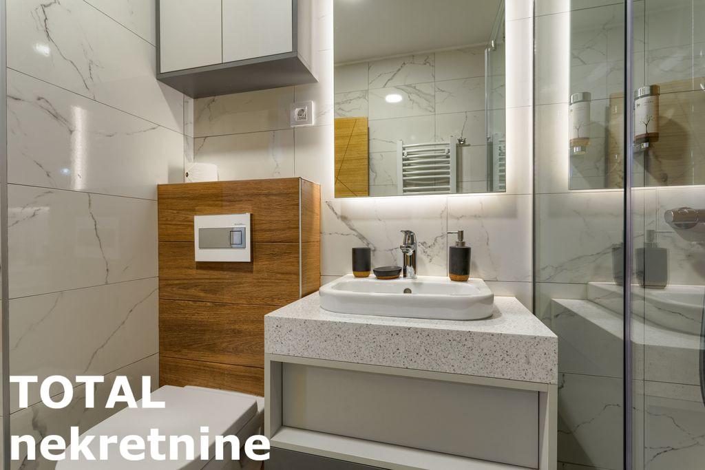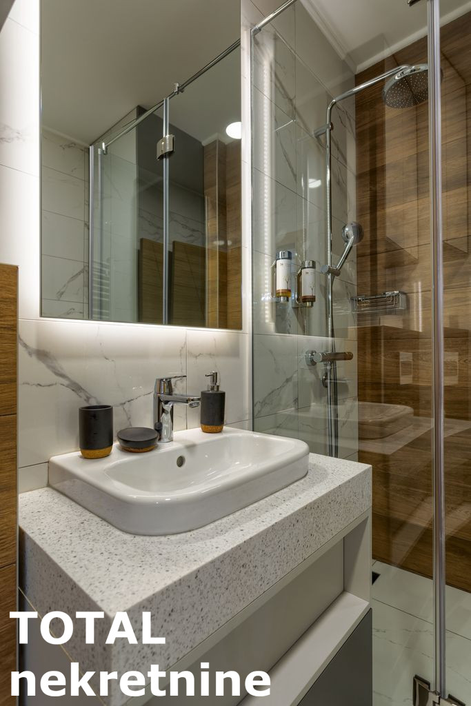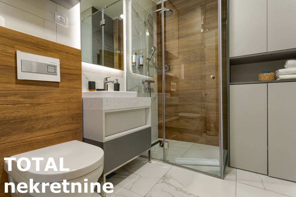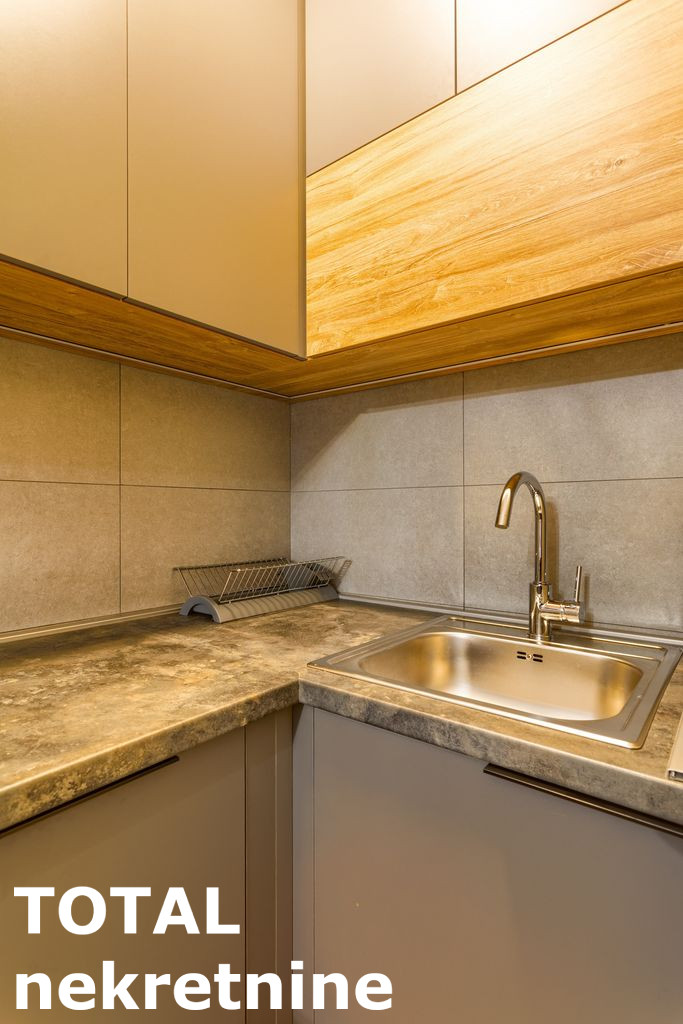 Kuhinja je sankom povezana sa dnevnom sobom (mali frizider, sporet sa ravnom plocom, rerna, masina za pranje sudova, aspirator – sve Bosh, mali bojer)